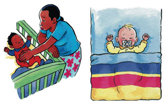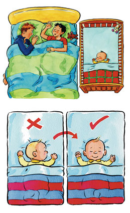 ze stópkami przylegającymi do dołu łóżeczka i otul je dokładnie pościelą do wysokości ramion.